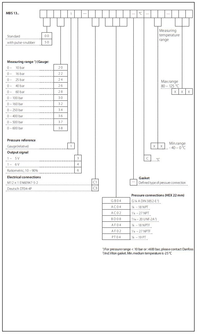 เพรสเชอร์ทรานสมิตเตอร์ DANFOSS รุ่น MBS 1300/1350 Series เป็นเครื่องส่งสัญญาณแบบเอาต์พุตคู่ (dual output transmitter) โดย Output 1 จะส่งสัญญาณความดัน ส่วน Output 2 จะส่งสัญญาณอุณหภูมิ สำหรับรุ่น MBS 1350 มาพร้อม Pulse-Snubber ในตัว ช่วยป้องกันการเกิดโพรงอากาศ และแรงกระแทกจากของเหลว ในขณะที่รุ่น MBS 1300 ไม่มี Pulse-Snubber