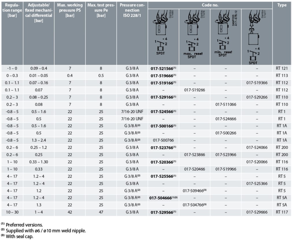 เพรซเชอร์สวิตช์ DANFOSS รุ่น RT Series (สวิตช์ควบคุมแรงดัน) ประกอบด้วยสวิตช์แรงดัน, สวิตช์แรงดันต่าง, สวิตช์แรงดันที่สามารถปรับโซนกลาง และ สวิตช์แรงดันสำหรับโรงงานไอน้ำ ซึ่งออกแบบมาเพื่อใช้งานทั่วไปในภาคอุตสาหกรรม
