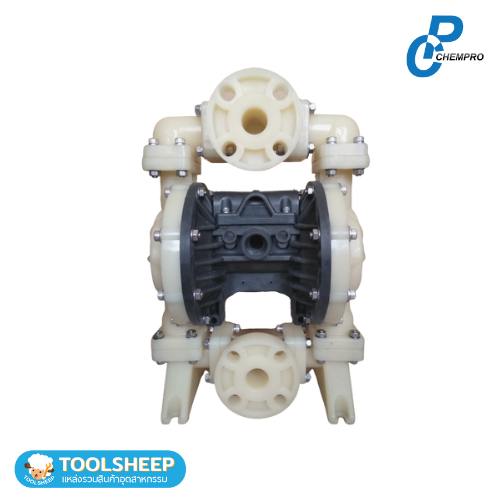 ปั๊มไดอะแฟรม CHEMPRO รุ่น DP25 แอร์ปั๊มไดอะแฟรม AODD (Air Operated Double Diaphragm Pump) ปั๊มสูบจ่ายสารเคมีที่ใช้การอัดอากาศเพื่อขับเคลื่อนการทำงานของตัวปั๊ม โดยทำงานร่วมกันกับแผ่นไดอะแฟรม (Diaphragm) เพื่อให้เกิดแรงดันในการสูบของเหลว รุ่น DP25 ขนาดท่อ 1 นิ้ว โดยของเหลว หรือสารเคมีจะออกมาจากตัวปั๊มในรูปแบบสโตรก (Stoke) ปั๊มเคมี-ปั๊มไดอะแฟรมชนิดนี้สามารถใช้ได้กับสารเคมีเกือบทุกประเภท ด้วยวัสดุตัวปั๊มและวัสดุภายในที่มีให้เลือกหลากหลายชนิด เช่น อลูมิเนียม (Aluminum), สแตนเลส (Stanless), พลาสติก (Polypropylene) และอื่นๆ ซึ่งมีจุดเด่นในเรื่องทนทานการกัดกร่อนจากสารเคมีที่เป็นกรด-ด่าง, น้ำมัน, สี, กาวน้ำ, น้ำเสีย, อาหารเหลว, หมึกพิมพ์, ครีม, สารละสาย, สารเคมีอื่นๆที่มีฤทธิ์กัดกร่อนสูง หรือของเหลวที่เป็นวัตถุไวไฟ (Explosion-proof) เนื่องจากตัวปั๊มใช้ลมในการขับเคลื่อน จึงไม่เป็นอันตรายต่อการทำงาน สามารถใช้กับของเหลวที่มีตะกอนแขวนลอยเจือปนอยู่ในของเหลว และสามารถใช้ได้กับของเหลวที่ความหนืดสูงได้เป็นอย่างดี (High Viscosity Liquids) และยังสามารถปรับอัตราการไหลและแรงดันได้ มี Self-priming ในตัวเอง สามารถใช้ในโรงงานปิโตรเลียม, โลหะ, วิศวกรรมเคมี , เหมืองแร่ , วัสดุเคลือบเซรามิก, อาหารและเครื่องดื่ม, โรงงานยา, การพิมพ์, การทำกระดาษ, สิ่งทอ, บำบัดน้ำเสีย, ยานยนต์ และอื่น ๆ