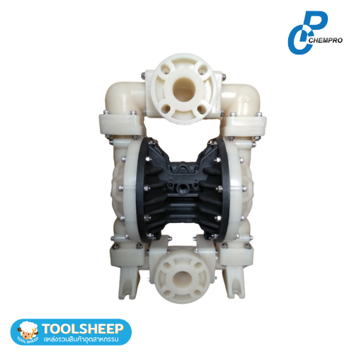 ปั๊มไดอะแฟรม CHEMPRO รุ่น DP-50 แอร์ปั๊มไดอะแฟรม AODD (Air Operated Double Diaphragm Pump) ปั๊มสูบจ่ายสารเคมีที่ใช้การอัดอากาศเพื่อขับเคลื่อนการทำงานของตัวปั๊ม โดยทำงานร่วมกันกับแผ่นไดอะแฟรม (Diaphragm) เพื่อให้เกิดแรงดันในการสูบของเหลว รุ่น DP50 ขนาดท่อ 2 นิ้ว โดยของเหลว หรือสารเคมีจะออกมาจากตัวปั๊มในรูปแบบสโตรก (Stoke) ปั๊มเคมี-ปั๊มไดอะแฟรมชนิดนี้สามารถใช้ได้กับสารเคมีเกือบทุกประเภท ด้วยวัสดุตัวปั๊มและวัสดุภายในที่มีให้เลือกหลากหลายชนิด เช่น อลูมิเนียม (Aluminum), สแตนเลส (Stanless), พลาสติก (Polypropylene) และอื่นๆ ซึ่งมีจุดเด่นในเรื่องทนทานการกัดกร่อนจากสารเคมีที่เป็นกรด-ด่าง, น้ำมัน, สี, กาวน้ำ, น้ำเสีย, อาหารเหลว, หมึกพิมพ์, ครีม, สารละสาย, สารเคมีอื่นๆที่มีฤทธิ์กัดกร่อนสูง หรือของเหลวที่เป็นวัตถุไวไฟ (Explosion-proof) เนื่องจากตัวปั๊มใช้ลมในการขับเคลื่อน จึงไม่เป็นอันตรายต่อการทำงาน สามารถใช้กับของเหลวที่มีตะกอนแขวนลอยเจือปนอยู่ในของเหลว และสามารถใช้ได้กับของเหลวที่ความหนืดสูงได้เป็นอย่างดี (High Viscosity Liquids) และยังสามารถปรับอัตราการไหลและแรงดันได้ มี Self-priming ในตัวเอง สามารถใช้ในโรงงานปิโตรเลียม, โลหะ, วิศวกรรมเคมี , เหมืองแร่ , วัสดุเคลือบเซรามิก, อาหารและเครื่องดื่ม, โรงงานยา, การพิมพ์, การทำกระดาษ, สิ่งทอ, บำบัดน้ำเสีย, ยานยนต์ และอื่น ๆ