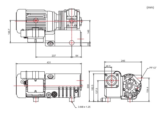 Model | Phase | Voltage (V) | Hz | Rated Output (kW) | Rated Current (A) | Ultimate Pressure (mbar) | Max. Pump Speed (m³/h) | Noise Level dB(A) | Oil Capacity (L) | Weight (kg) |