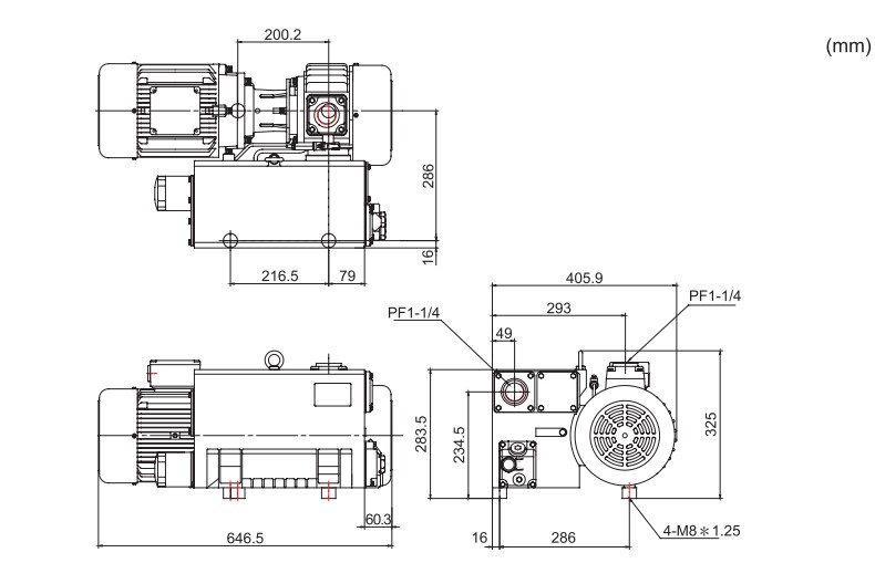 | Model | Phase | Voltage (V) | Hz | Rated Output (kW) | Rated Current (A) | Ultimate Pressure (mbar) | Max. Pump Speed (m³/h) | Noise Level dB(A) | Oil Capacity (L) | Weight (kg) |