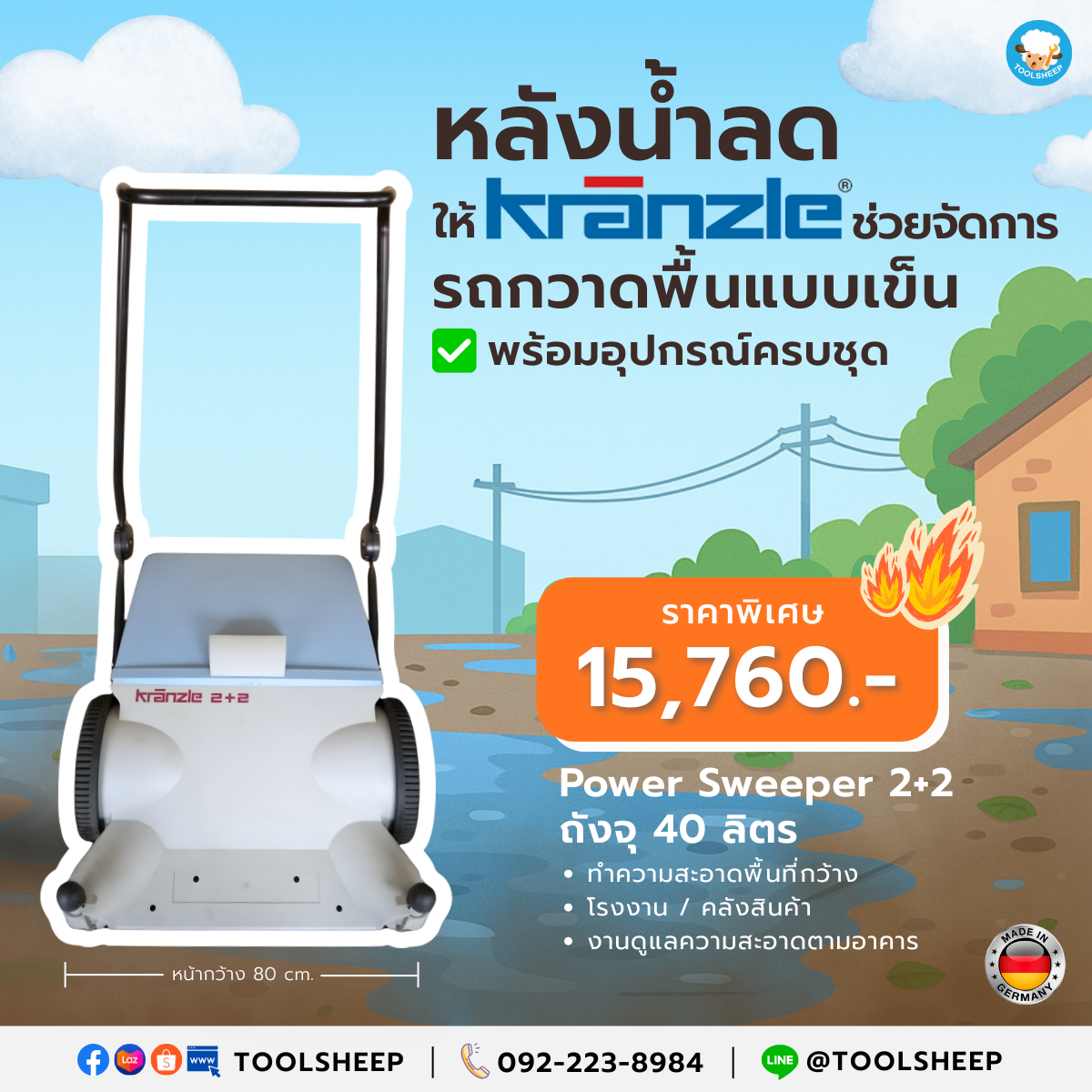 เครื่องกวาดพื้น KRANZLE รุ่น Power Sweeper 2+2 รถกวาดพื้นแบบเดินตาม เป็นอุปกรณ์ทำความสะอาดใช้ในการกวาดพื้นทั้งในบ้านเรือน หรือโรงงานอุตสาหกรรม ใช้งานง่าย